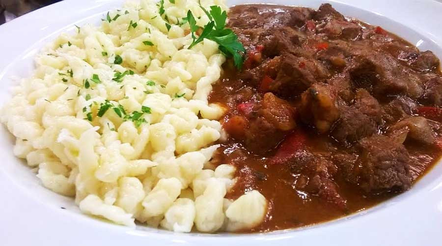 Traditional big Bavarian Wurstel w/fried egg and potatoes salad